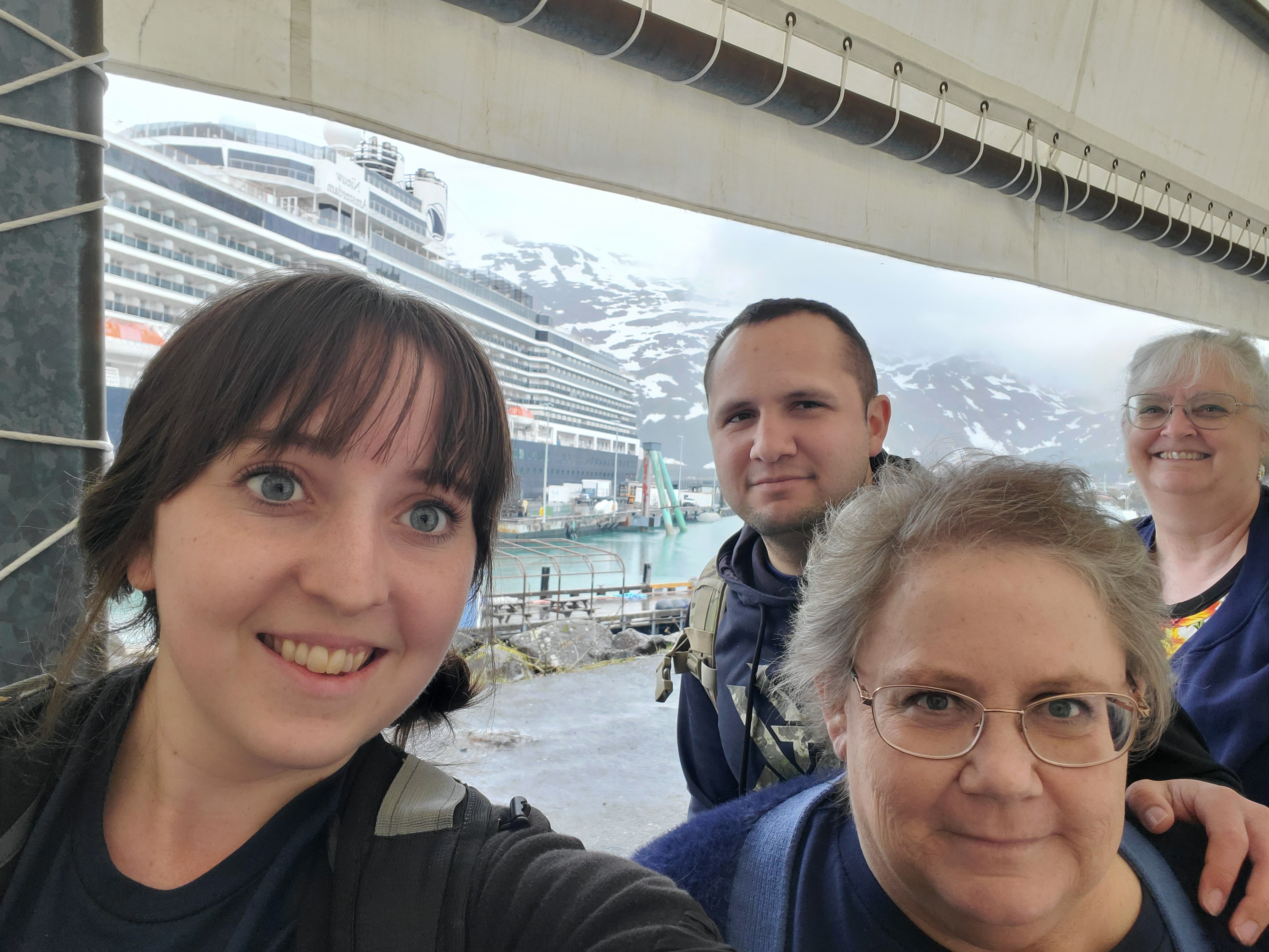We got to the airport around and checked in with the cruise line representatives. They took our luggage so they could transport it in a semi-truck to the ship, and then they deliver it to your room. They assigned us to the 1PM shuttle to Whittier, so we had about 2 hours to wait. We just chatted and relaxed in some seats. Anthony napped for a bit and then we got on the bus. Mama and Pamela got to sit up front in a reserved row since mama has the walker.